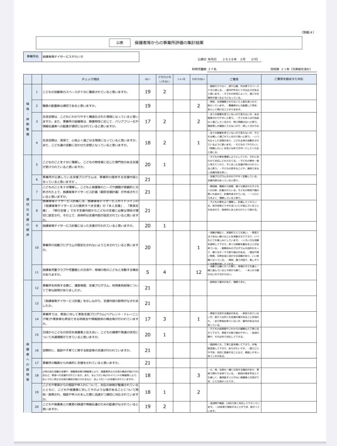 2026.02.27 お知らせ 令和7年度 そらいろ 事業所内アンケート結果 令和7年度における事業所内に関する、保護者様へのアンケート・職員による自己評価アンケートを実施しました。事業所評価の集計が出ましたので掲示いたします。 令和7年度 そらいろ 保護者等からの事業所評価結果(放デイ)ダウンロード 令和7年度 そらいろ 事業所評価(放デイ)ダウンロード 令和7年度 そらいろ 事業所評価(児童発達支援)ダウンロード 令和7年度 そらいろ 自己評価総括(放デイ)ダウンロード 令和7年度 そらいろ 自己評価総括(児童発達支援)ダウンロード Tweet Share +1 Hatena Pocket RSS feedly Pin it